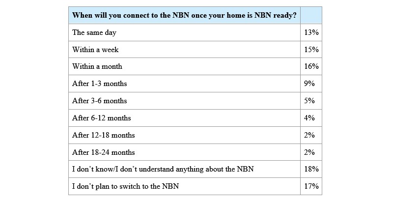 Even among those that have made a plan to switch, almost 2% said they will be switching between 18 & 24 months after it arrived in their area. These people would be left in the dark as within 18 months of NBN availability, telcos are obliged to deactivate existing copper lines.